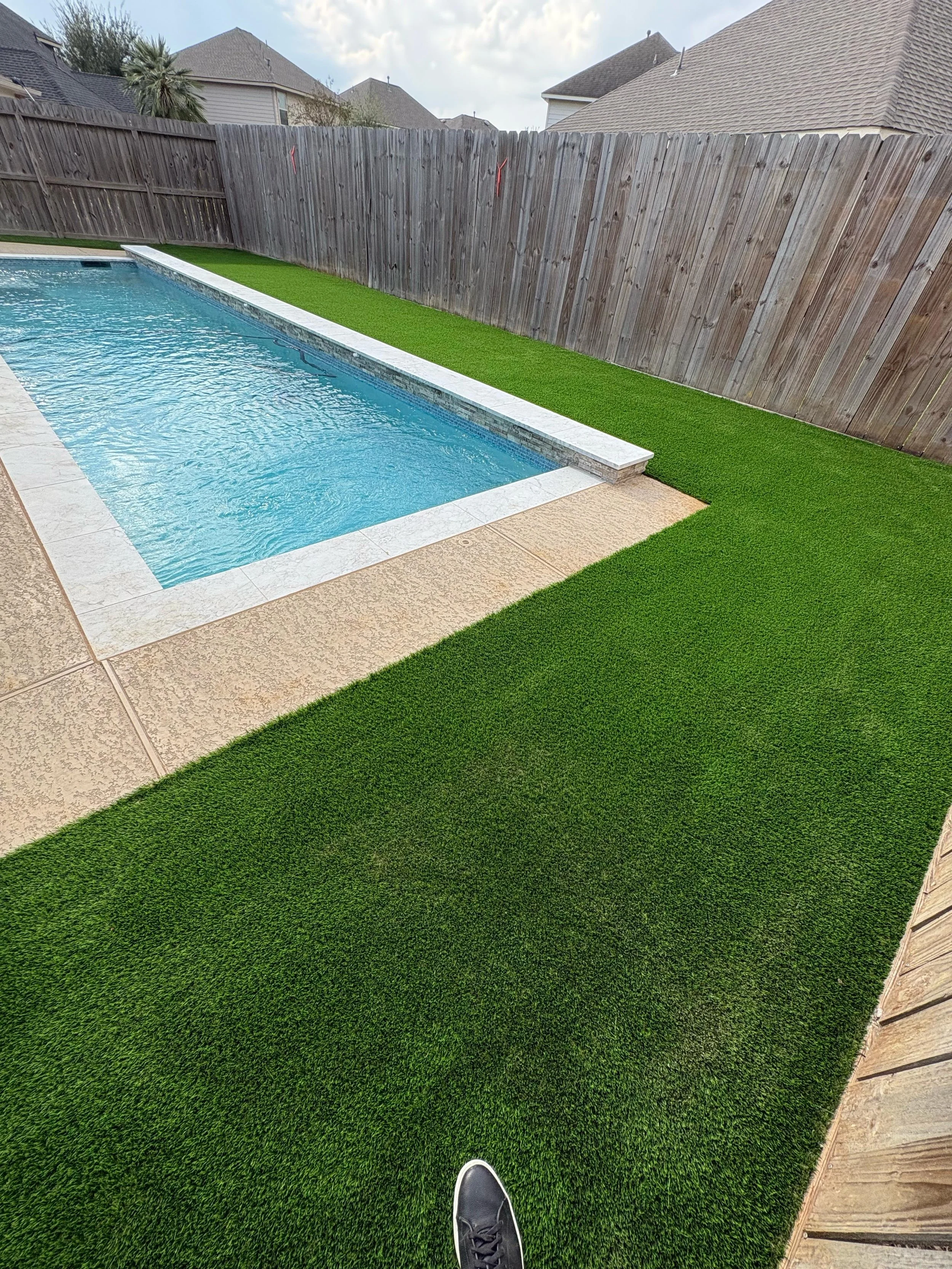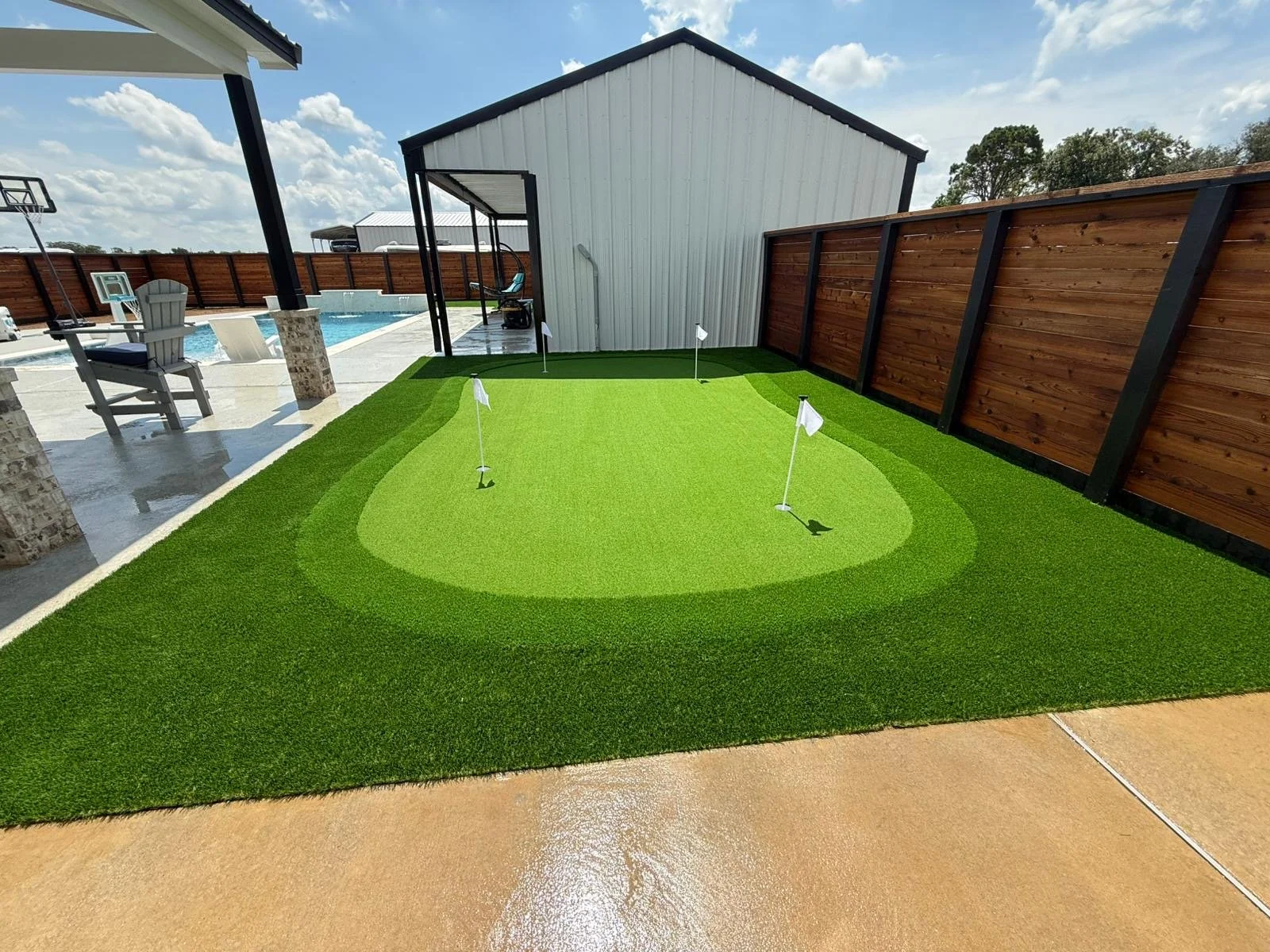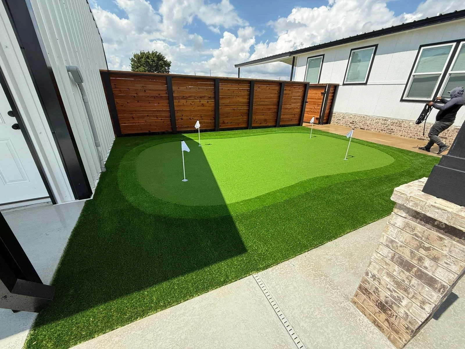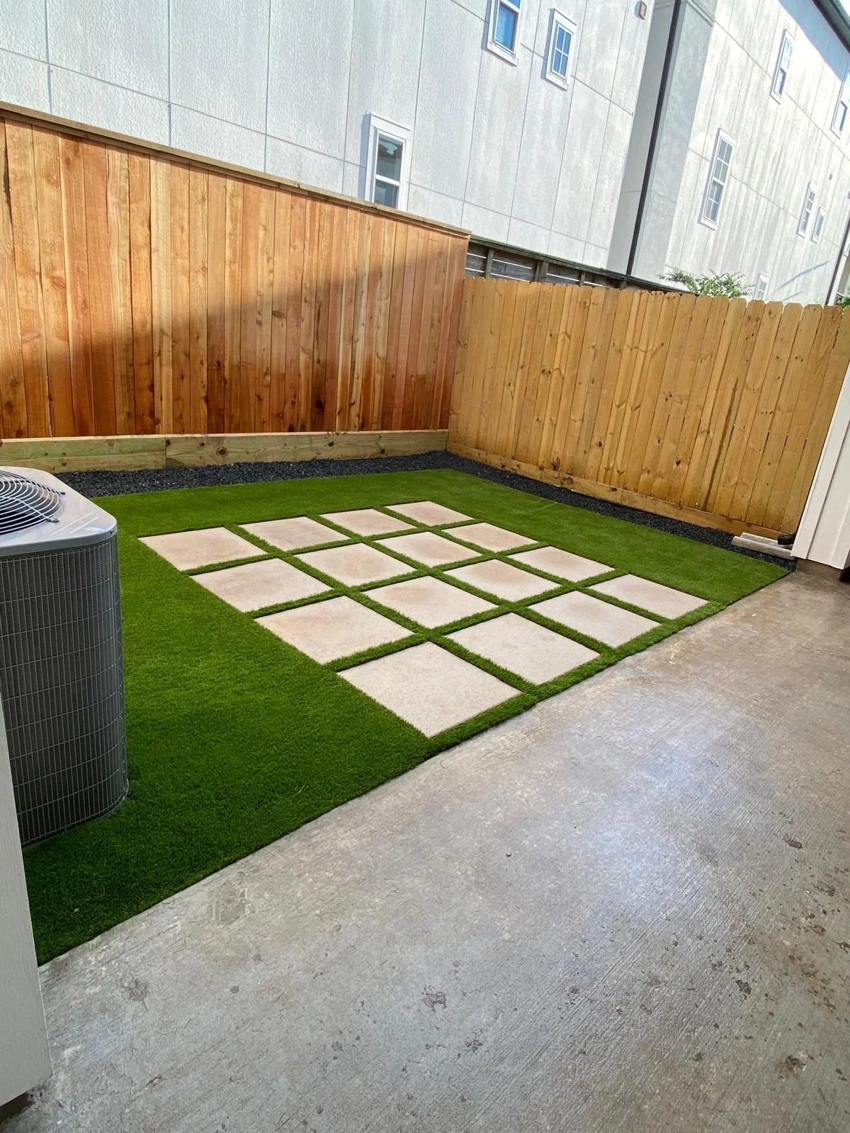 A synthetic turf application is popular in commercial spaces for reducing water bills, maintenance, and concerns about the upkeep.